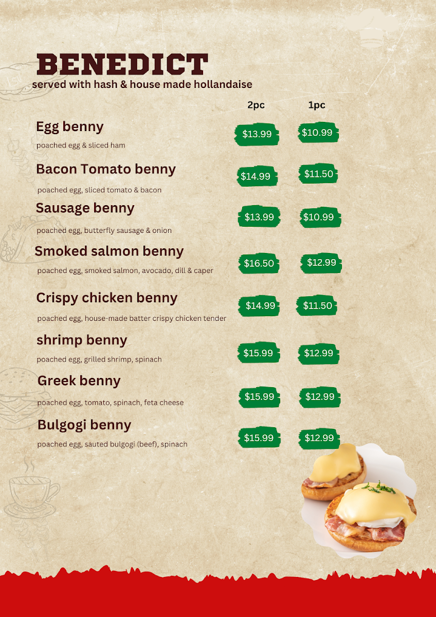 The menu shines with an array of breakfast favorites, notably the acclaimed smoked salmon Benny and a variety of Eggs Benedict, perfect for both hearty appetites and lighter fare. The cafe also boasts affordability without compromising quality, making it a staple for locals and visitors alike.
